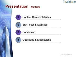This document discusses the importance of statistics in call centers and introduces the StatTicker software for monitoring call center statistics. Key points include: