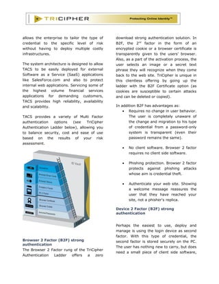 The TriCipher Armored Credential System (TACS) provides strong multi-factor authentication for SalesForce.com by integrating with SalesForce.com through a single sign-on process. TACS offers various authentication methods from passwords to biometric scans. It seamlessly enhances SalesForce.com's security without changing the user experience.