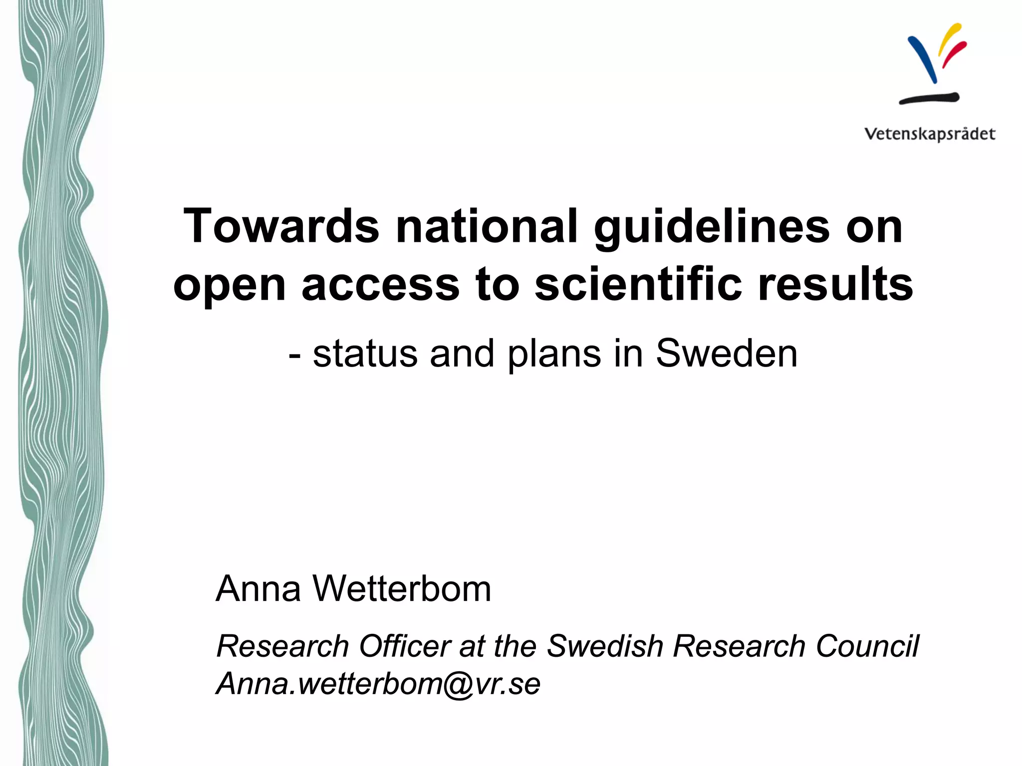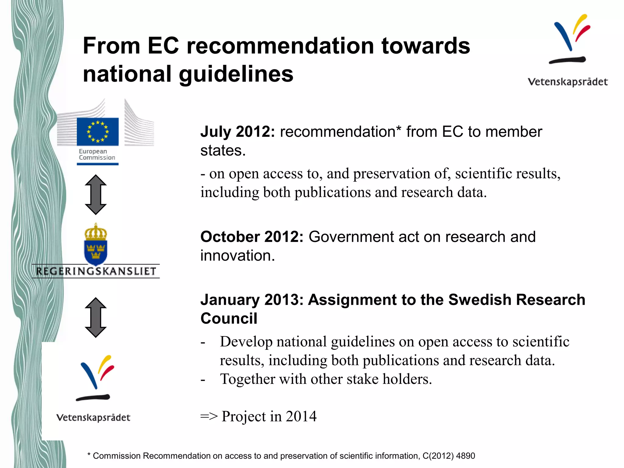 The Swedish Research Council was assigned to develop national guidelines on open access to scientific results, including both publications and research data. They held a project in 2014 where they gathered input from researchers, research funders, universities, and other stakeholders. This resulted in a first draft of proposed national guidelines that was circulated for comment. The key points of the proposed guidelines were that open access to research data funded by the government should be the norm, with exceptions, and that data should be made freely available along with publications and archived for long-term preservation. The next steps involved further stakeholder reviews and approval of the guidelines by the Swedish Research Council board before delivering them to the Government.