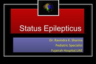Status epilepticus is a medical emergency that requires prompt treatment to prevent neurological damage or death. It is defined as continuous seizure activity lasting more than five minutes or two or more discrete seizures between which there is incomplete recovery of consciousness. The document discusses the definition, causes, pathophysiology, treatment approach, and medications used to treat status epilepticus in children. Treatment involves stabilizing the patient, administering rapid-acting anticonvulsants like lorazepam followed by long-acting medications like fosphenytoin if seizures persist, with progression to anesthetic treatments in refractory cases to stop seizures.