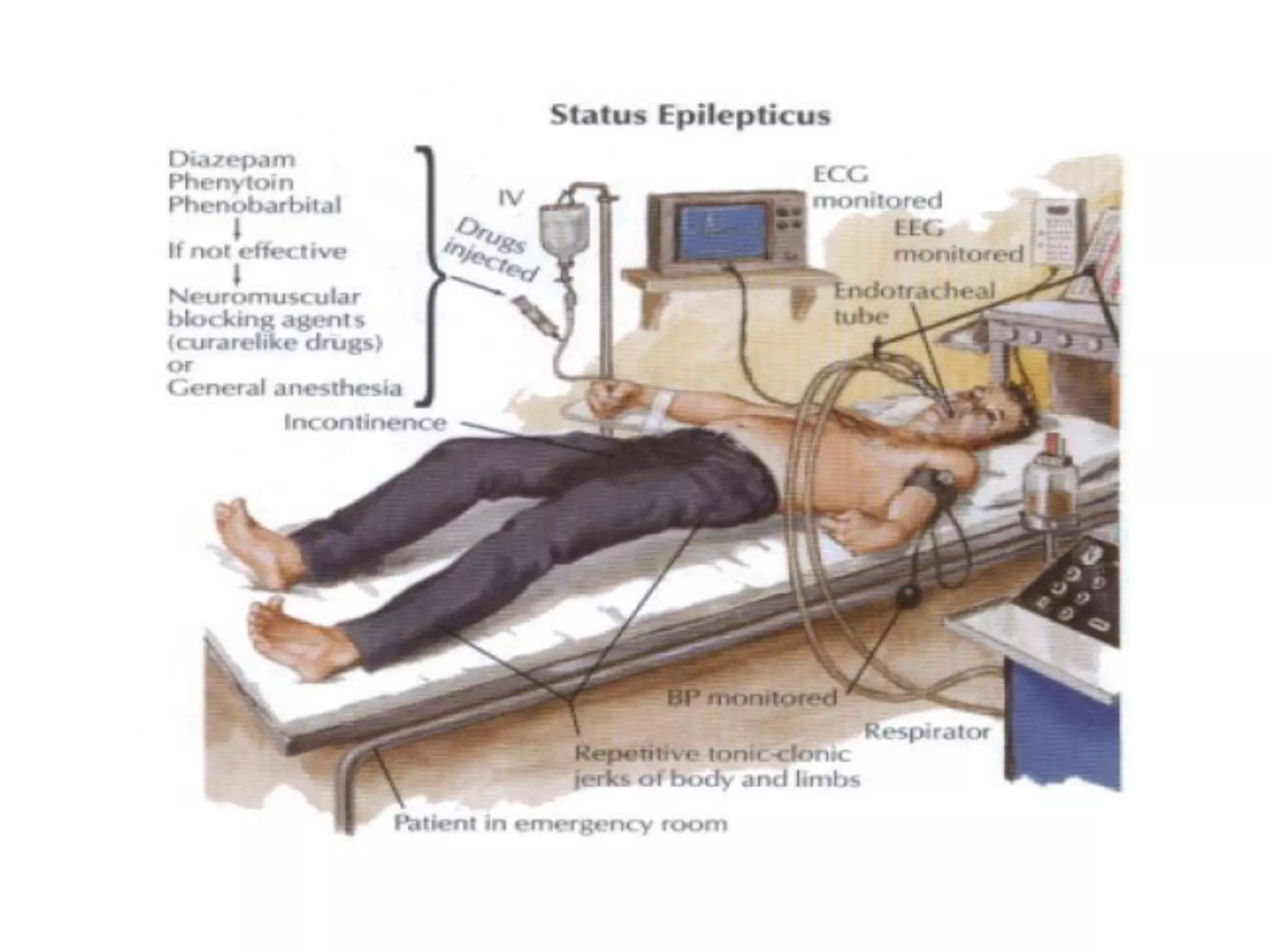 Status epilepticus is a life-threatening condition involving prolonged or repeated seizures without recovery between seizures. Intravenous administration of anti-seizure medications is required for treatment. Diazepam or lorazepam are usually effective for terminating seizures in the short-term, while phenytoin or fosphenytoin are preferred for prolonged therapy due to being highly effective with less sedation. If seizures are not controlled by first-line treatments, phenobarbital may be used, and refractory cases may require general anesthesia. Close monitoring is important due to risks of respiratory depression, hypotension, and cardiotoxicity from some medications.