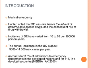 1. Status epilepticus (SE) is a medical emergency defined as a seizure lasting more than 5 minutes or recurrent seizures without regaining consciousness. SE can be convulsive or non-convulsive.