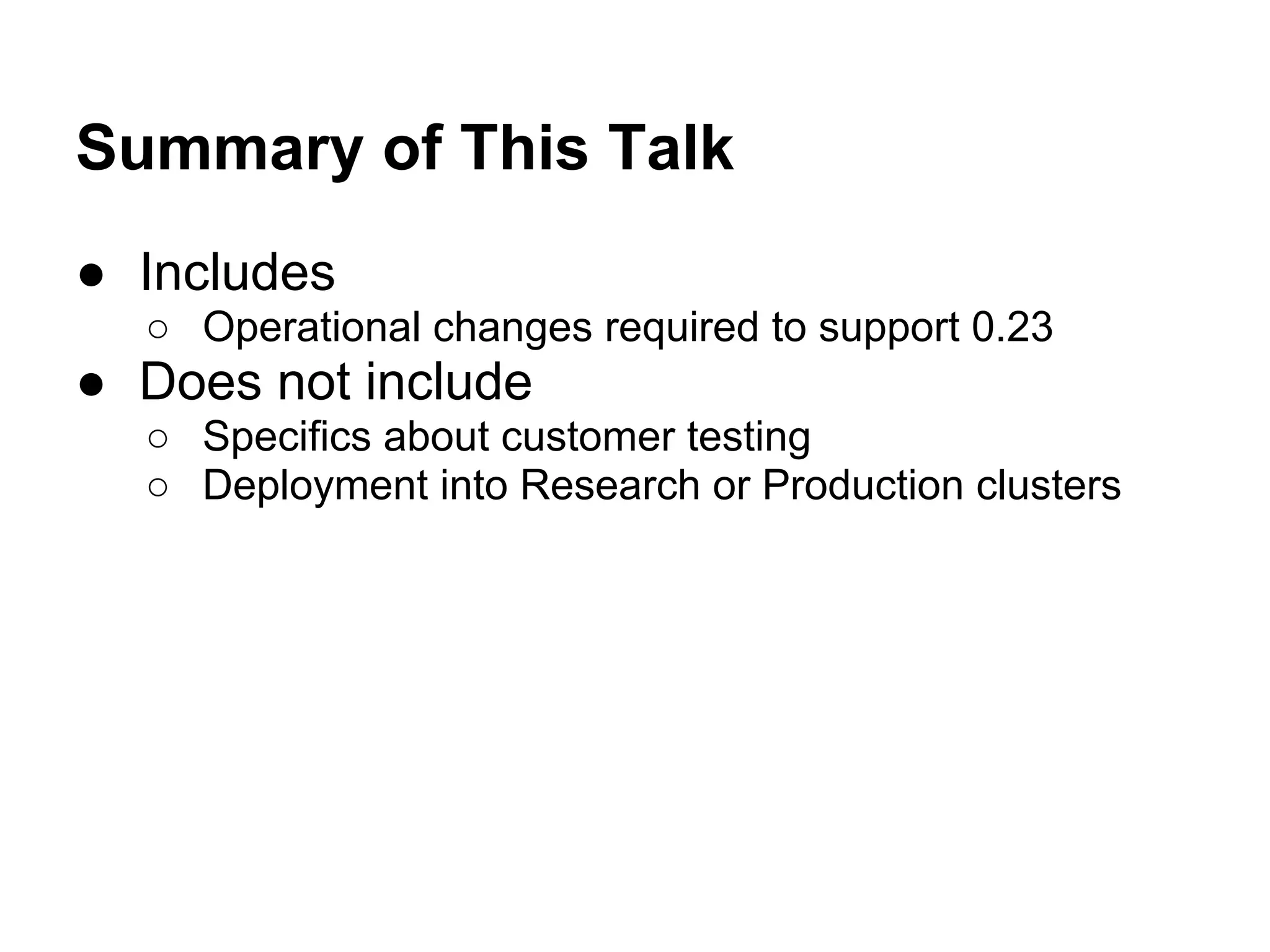 The document summarizes the process Yahoo! undertook to upgrade its Hadoop clusters from version 0.20 to 0.23. It involved providing a 420-node sandbox cluster running 0.23 for customer testing, configuring queues and memory settings, and adding Kerberos authentication. Init scripts were modified for the DataNode, NameNode, SecondaryNameNode, HistoryServer, ResourceManager and NodeManager to start the new Hadoop versions.