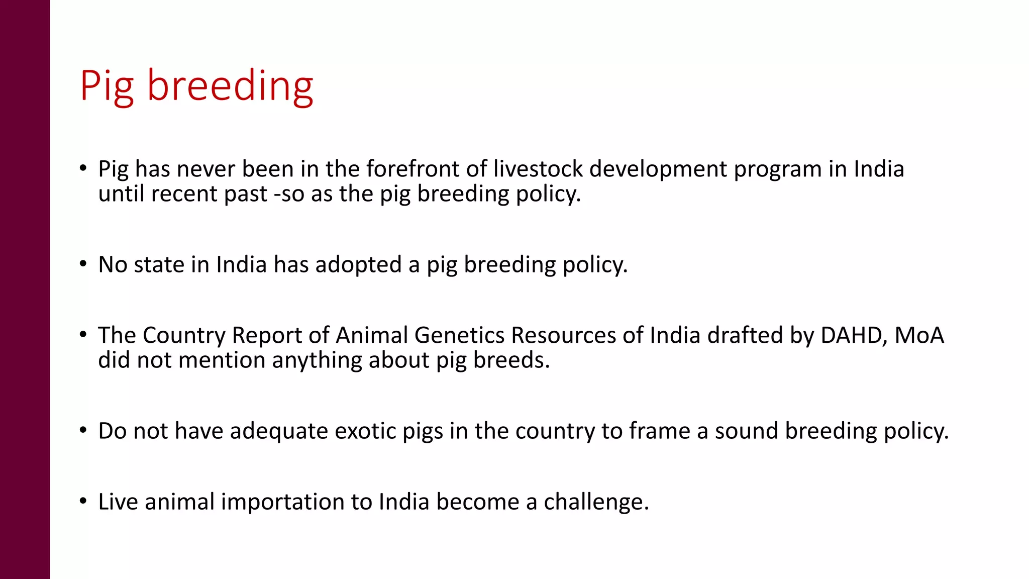 The document discusses the status of pig breeding policies and practices in India, highlighting the lack of a formal breeding policy and the challenges faced in improving pig genetics. It outlines various historical milestones in pig breeding, strategies adopted by different states, and the current limitations in germplasm distribution and government support. The text also emphasizes the need for better management practices, technical support, and conservation of indigenous breeds to enhance the overall performance of pig production in the country.
