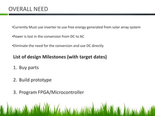 The team is working on a DC distribution controller to directly use free energy from solar panels without converting to AC. Their recent tasks included finishing an outline for an IEEE competition paper and meeting with a mentor. Upcoming tasks are to finish the competition paper, finalize the product selection list, and purchase products to build a prototype. Their schedule includes buying parts by January 10th, building a prototype by February, and programming an FPGA/microcontroller by March 5th.