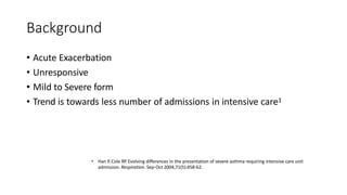 Status asthmaticus is a severe exacerbation of asthma that is unresponsive to initial treatment. It involves both an early bronchospastic component and later inflammatory response leading to airway obstruction. Treatment goals are to reverse airway obstruction, correct hypoxemia, and prevent complications. Mainstay treatments include nebulized beta-2 agonists, systemic steroids, theophyllines, and mechanical ventilation if needed. Impulse oscillometry testing can objectively monitor response to treatment. With aggressive treatment, prognosis is generally good except when combined with other conditions.