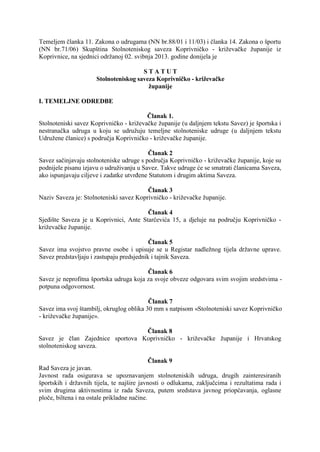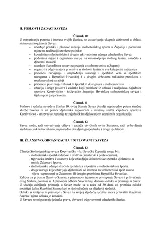Stolnoteniski savez koprivničko-križevačke županije osnovan je kao sportska udruga za udruživanje osnovnih stolnoteniskih udruga u županiji, s ciljem razvijanja i unapređivanja stolnoteniskog sporta. Upravni odbor upravlja savezom, a članice su različite sportske udruge i klubovi te je osigurano da odlučivanje bude javno i transparentno. Statut propisuje način rada, članstvo i prava članova, uključujući obveze prema savezu i pravilnike o izborima unutar uprave.