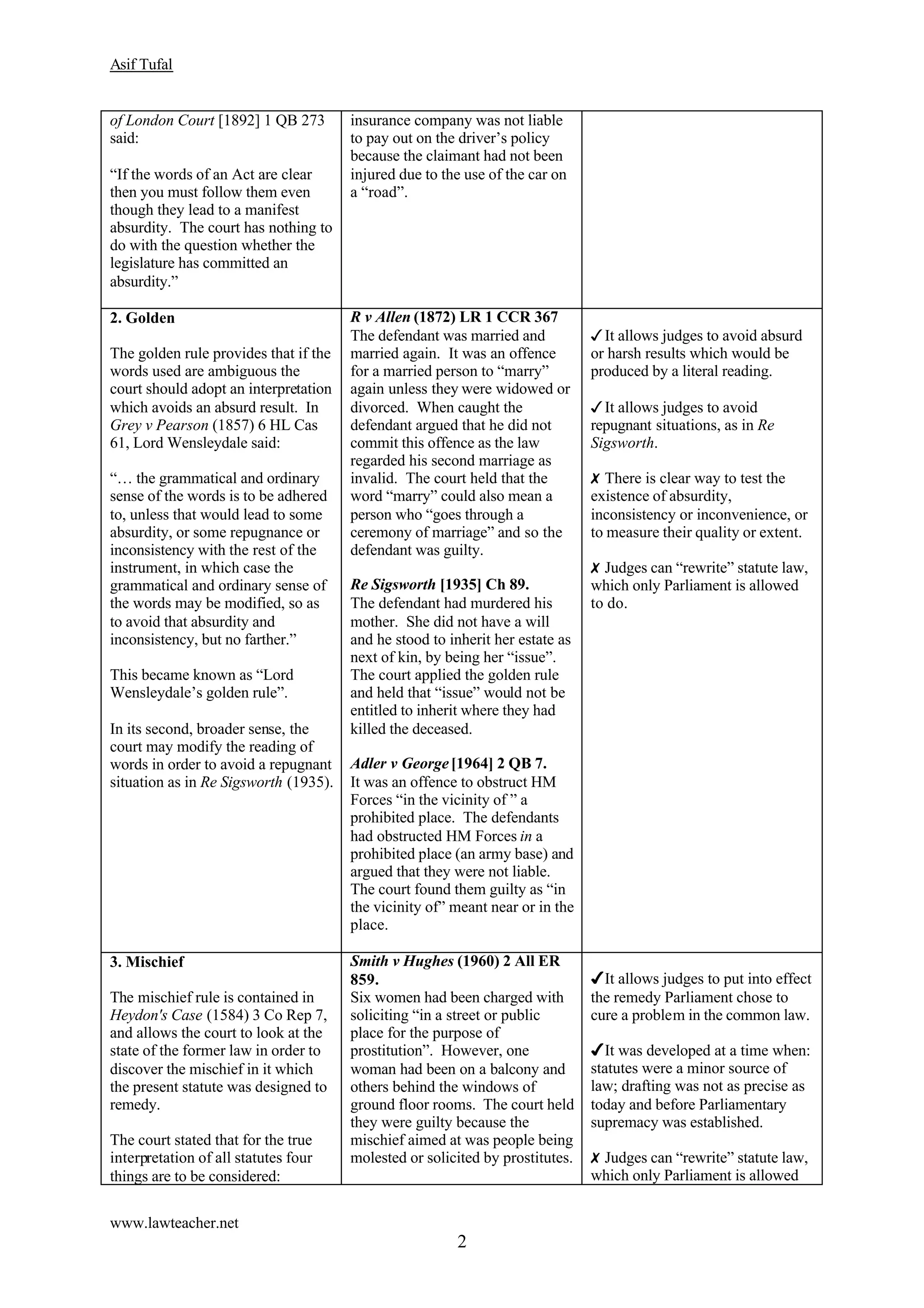This document discusses various rules and approaches to statutory interpretation used by judges when interpreting legislation. It identifies 5 main rules - the literal rule, the golden rule, the mischief rule, the purposive approach, and the integrated approach. It also discusses various canons of language interpretation like ejusdem generis and noscitur a sociis. Finally, it outlines both internal aids within statutes like long titles, and external aids outside statutes like dictionaries, other statutes, and parliamentary materials that judges may consider when interpreting statutes.