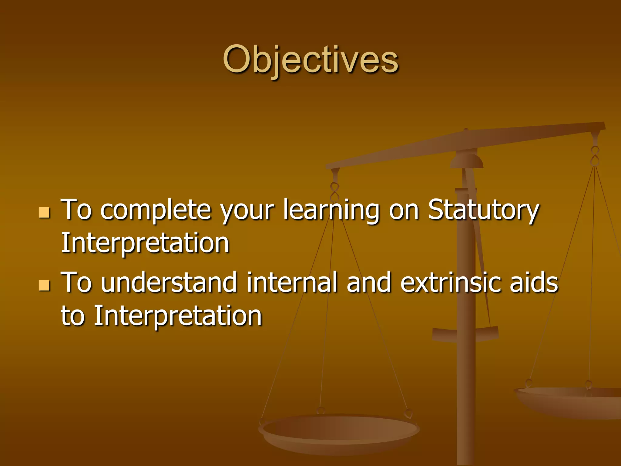 This document discusses statutory interpretation and aids to interpretation. It begins by outlining the objectives and providing examples of types of statutory interpretation rules. It then discusses internal aids to interpretation, including examining the statute, long title, preamble, headings, schedules, explanatory notes, and presumptions. It also discusses rules of language used in interpretation like ejusden generis. External aids discussed include dictionaries, law commission reports, historical setting, treaties, and Hansard. The effect of the Human Rights Act 1998 and precedent on statutory interpretation is also examined. Students are then asked to think about teaching this topic, including activities, checks for understanding, and starter/plenary ideas. The next period's task is to complete a worksheet using textbooks