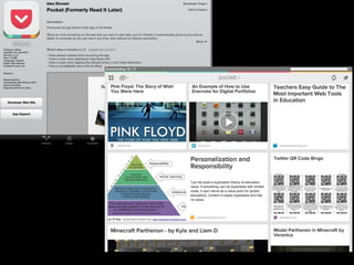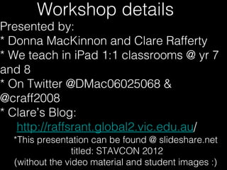 The document outlines a workshop led by Donna Mackinnon and Clare Rafferty focused on utilizing iPads in Year 7 and 8 classrooms. It includes a list of valuable educational apps and resources aimed at enhancing creativity and collaboration among students. The presentation emphasizes the importance of continuous learning for teachers, featuring a quote by John Cotton Dana.