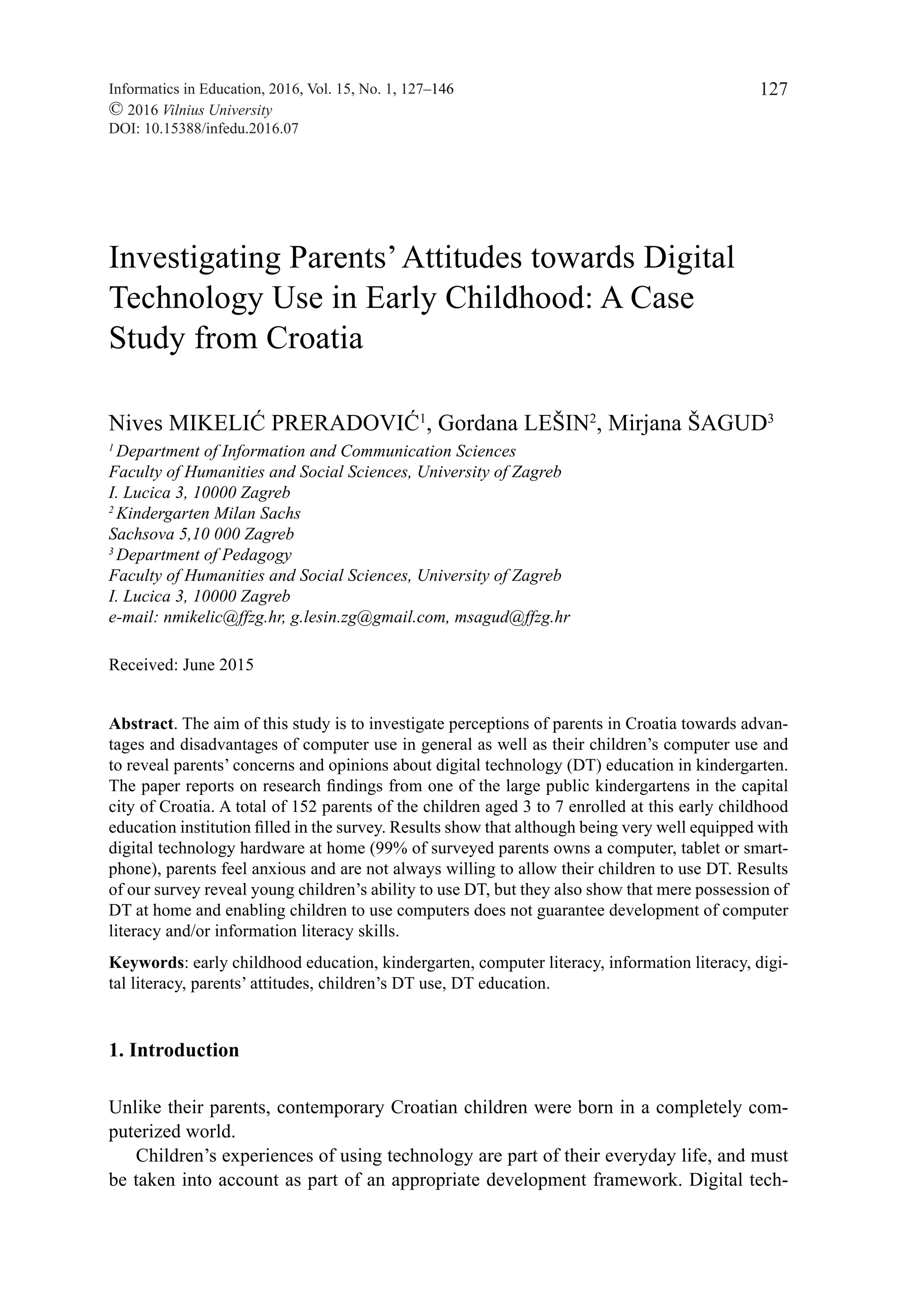 This document summarizes a study that investigated parents' attitudes towards digital technology use in early childhood education in Croatia. A survey of 152 parents at a public kindergarten found that while parents are well equipped with digital devices at home, they feel anxious about allowing young children to use technology. The survey aimed to understand what children do with technology at home and whether parents are aware. The document also reviews literature on both the benefits and risks of early digital technology use, finding the research remains divided. It concludes that developmentally appropriate technology integration that meets children's needs can enhance learning if based on child development principles.