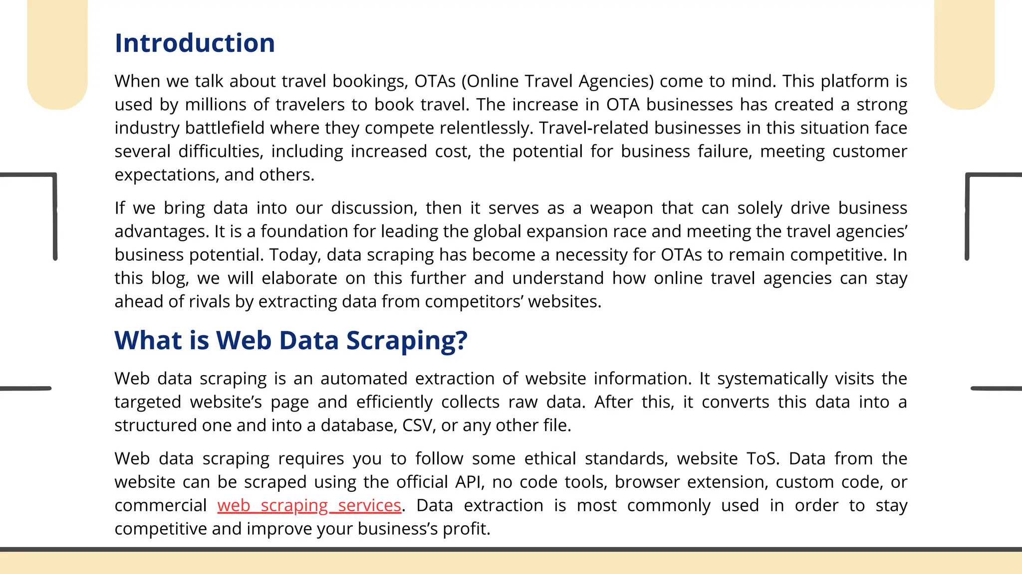 Web scraping for OTAs helps travel platforms stay ahead by offering real-time insights into hotel prices, flight options, and competitor deals. With accurate data updating constantly, OTAs can optimize their listings and deliver better offers. This smarter decision-making keeps them competitive in a fast-moving travel market.