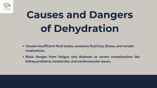 Dehydration occurs when the body loses more fluids than it takes in, which can result from various factors such as insufficient intake, excessive loss, or illness. Symptoms range from mild signs like thirst and fatigue to severe complications including confusion and fainting. Treatment varies based on severity, with prevention strategies highlighting the importance of regular fluid intake and monitoring hydration levels.