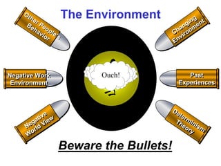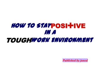 The document provides tips for staying positive in a tough work environment. It discusses negative factors like poor management, unrealistic deadlines, and competition. It also examines how past experiences and negative world views can influence one's attitude. The document recommends choosing a positive attitude by taking responsibility for one's thinking and behavior. Specific tips include spreading smiles, focusing on daily positives, and evaluating one's own contributions. An overall message is that attitude is a choice and positive behavior can influence one's environment.