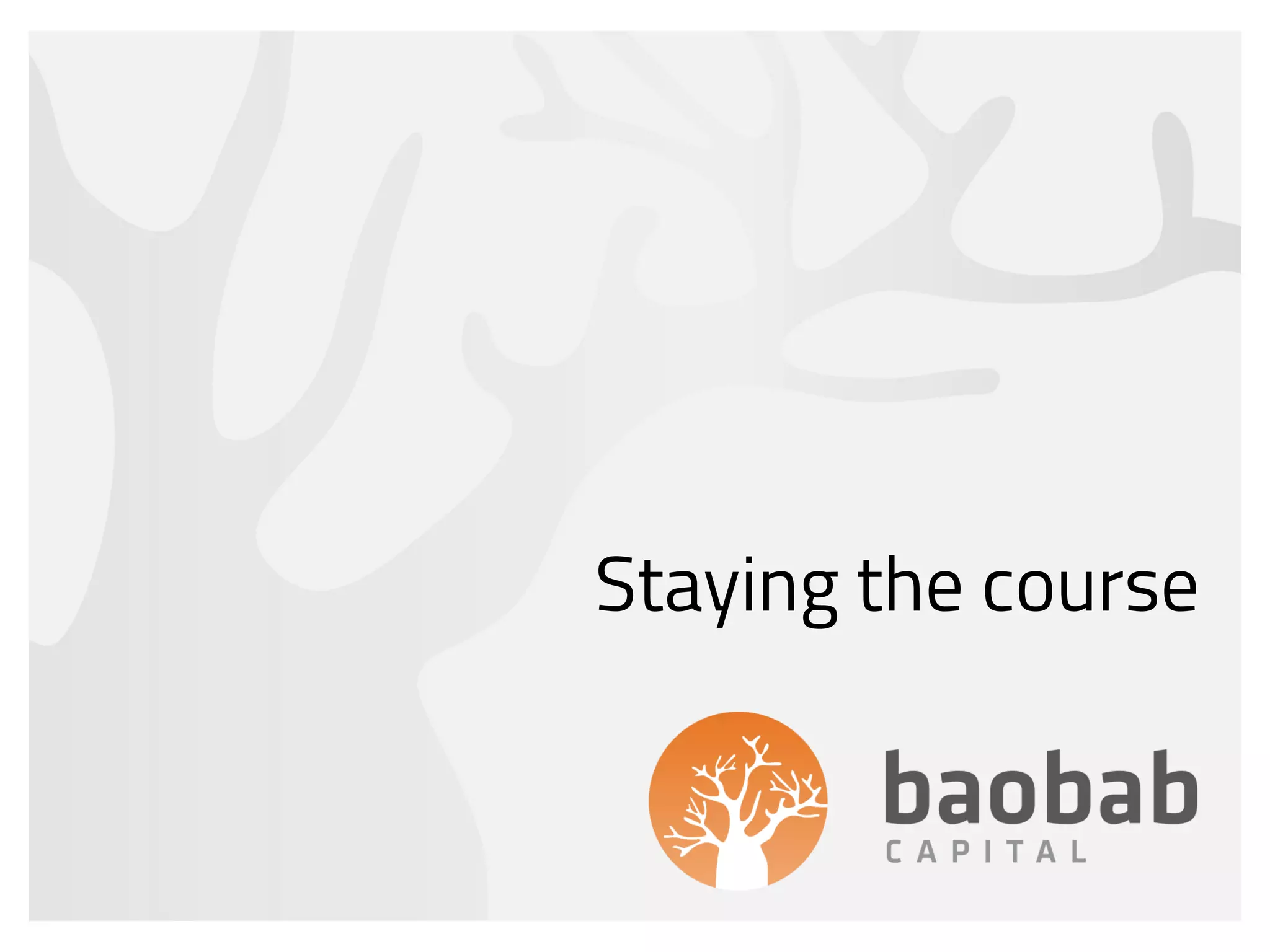 This document discusses the importance of staying invested in the market through declines. It shows that if an investor had held their investment through the Global Financial Crisis (GFC) it would be worth R279k today, whereas selling at the lowest point and waiting a year to reinvest would have resulted in a balance of R204k, and staying in cash would be worth only R124k. Additionally, missing just 25 of the best market days between 1995-2016 would lower the annualized return from 15% to 8%. The risk of loss in equities also decreases the longer the investment time horizon, with risk of loss at 18% for a one-year period compared to 0% for a 10-year period. Overall,