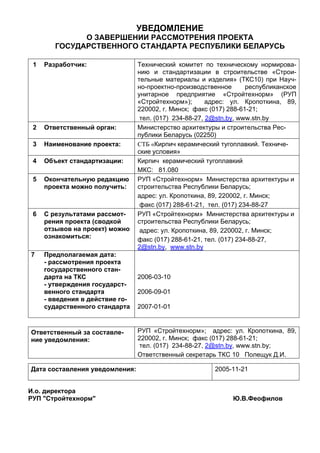 Документ содержит уведомление о завершении рассмотрения проекта государственного стандарта Республики Беларусь на керамический тугоплавкий кирпич, разработанный Техническим комитетом по техническому нормированию и стандартизации в строительстве. Ответственным органом является Министерство архитектуры и строительства, а окончательные редакции и результаты рассмотрения проекта доступны через РУП 'Стройтехнорм'. Утверждение государственного стандарта планируется на 1 сентября 2006 года, с введением в действие 1 января 2007 года.