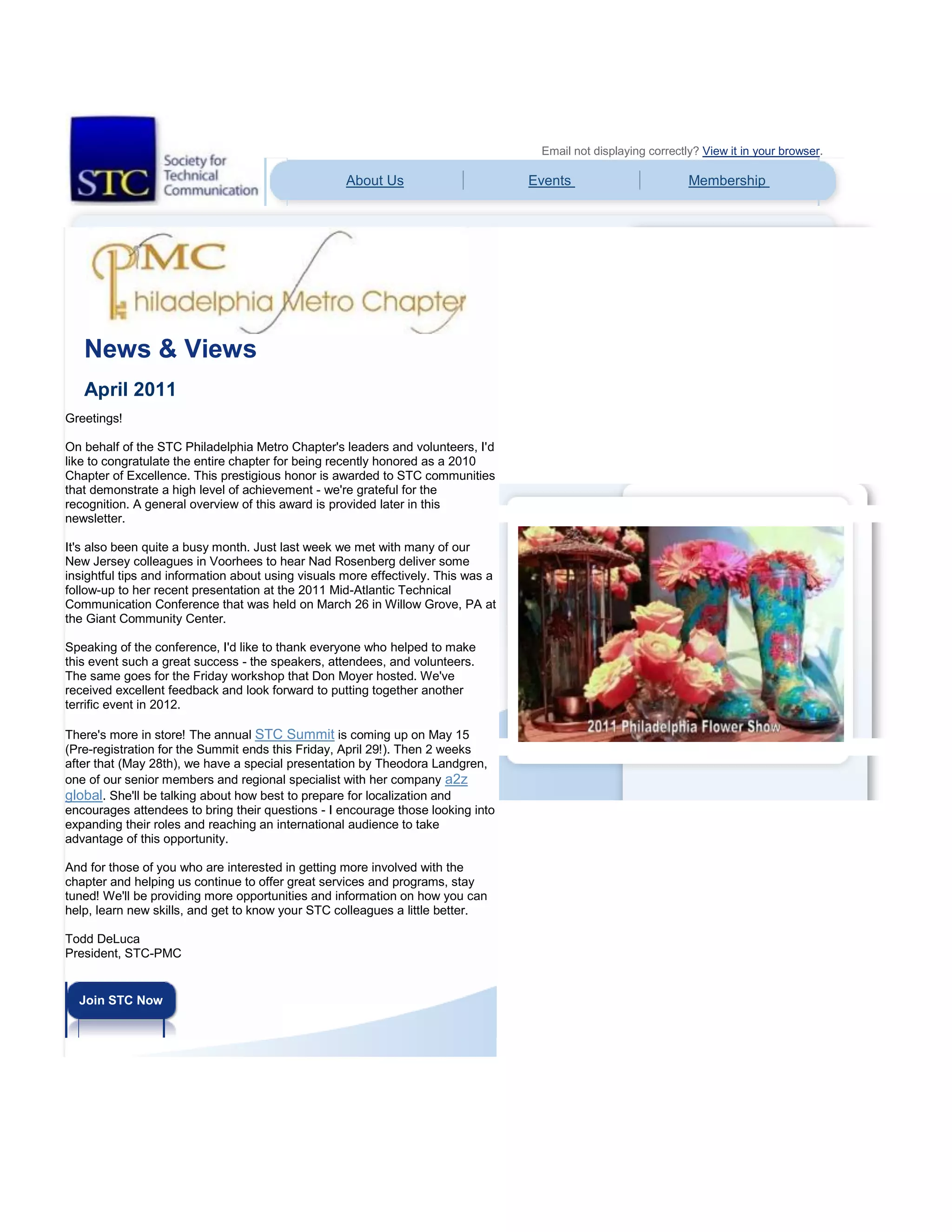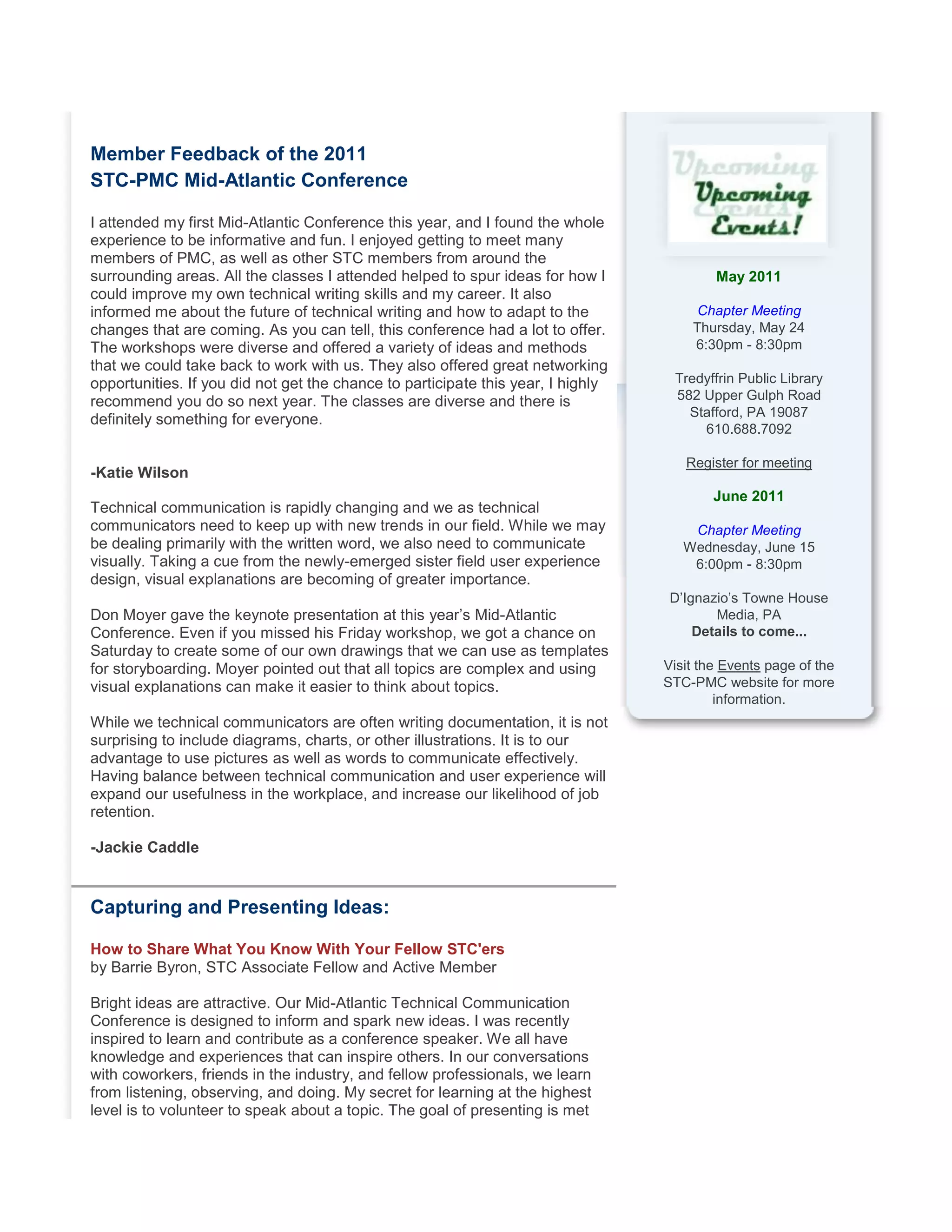 The newsletter summarizes recent activities of the STC Philadelphia Metro Chapter, including being honored as a 2010 Chapter of Excellence. It announces upcoming events like the annual STC Summit and a presentation on preparing for localization. It also provides feedback from attendees of the recent Mid-Atlantic Technical Communication Conference, and encourages members to get more involved and consider presenting at future conferences.