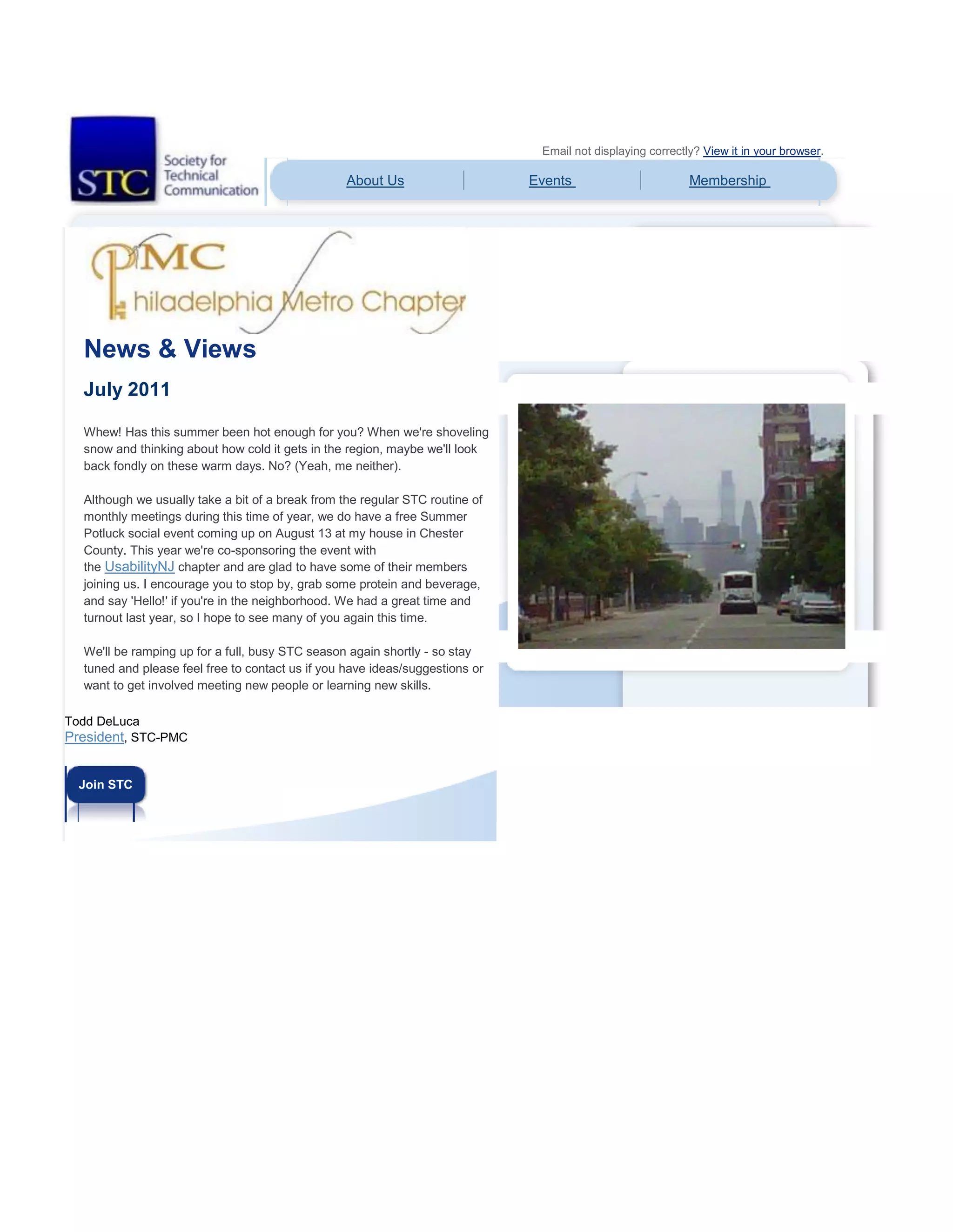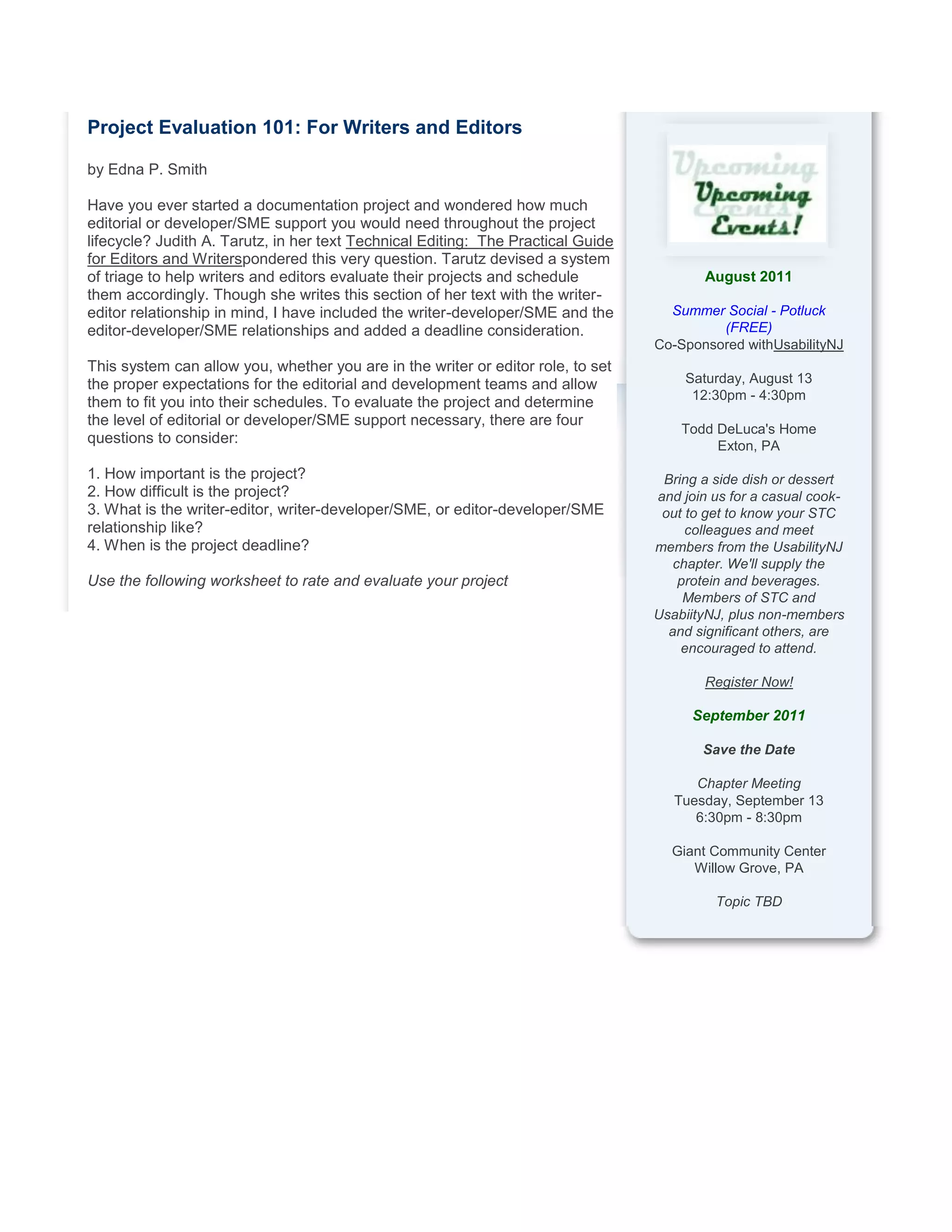The document is the August 2011 newsletter for the STC-PMC (Society for Technical Communication Philadelphia Metro Chapter). It announces an upcoming free summer potluck social event on August 13th co-sponsored with UsabilityNJ. It also provides information about upcoming chapter meetings in September and October. Additionally, it includes job listings and opportunities as well as the publication schedule for the newsletter.