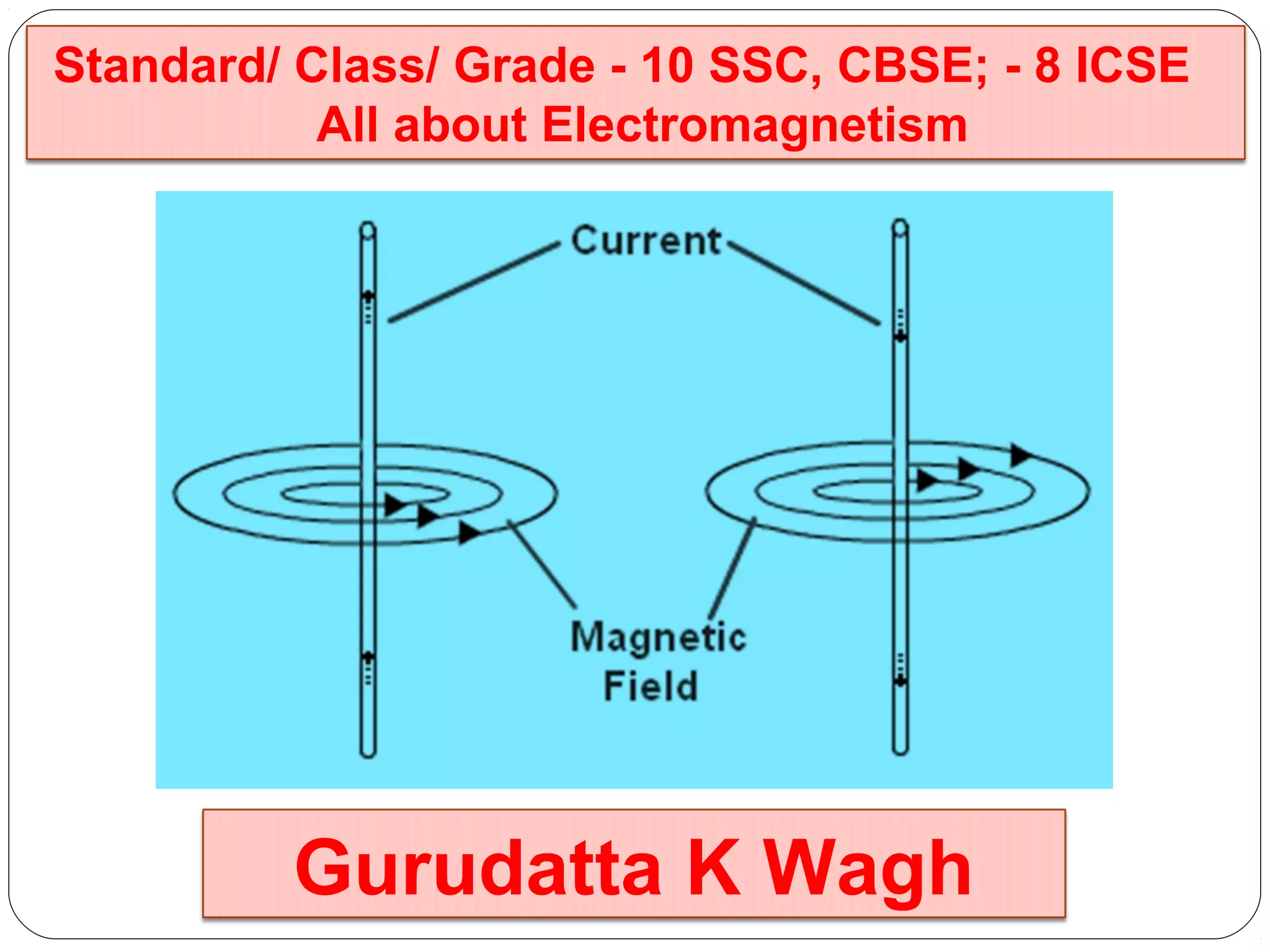 This document provides an overview of electromagnetism concepts for 10th grade students. It discusses magnetic field lines and their properties, the magnetic field created by current-carrying conductors using the right-hand rule, and the force experienced by conductors in magnetic fields. It also describes electromagnetic induction, the working principles of electric motors and generators, different current types, domestic electric circuits, and safety measures for working with electricity. Real-world applications of these concepts in technologies like MRI machines, trains, and power transmission are also mentioned.