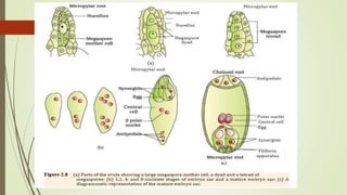 The document discusses the sexual reproduction in flowering plants, detailing the structure and function of the reproductive organs including flowers, stamens, and ovaries. It explains the development of anthers and pollen grains, including processes like microsporogenesis and megasporogenesis, alongside the significance of pollen in reproduction and its economic importance. Additionally, it covers pollination types, including self and cross-pollination, and the mechanisms plants use to ensure successful fertilization.