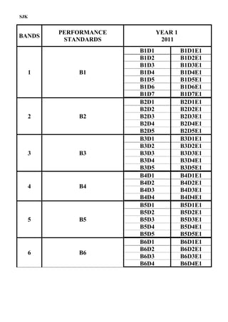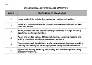 This document outlines the performance standards, descriptors, evidence and instruments for assessing English language performance in Year 1 of primary school. It includes 6 bands of standards related to listening, speaking, reading and writing skills. Each band contains standards, descriptors of what students should be able to do, evidence of achieving the standards, and examples of assessment instruments. The standards progressively increase in difficulty from basic skills in Band 1 to appreciating literary works in Band 6.