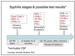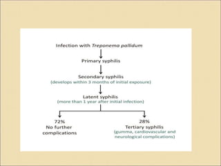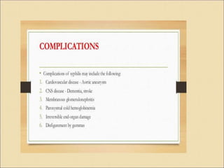 Syphilis is a sexually transmitted disease caused by the bacterium Treponema pallidum. It has several stages including primary, secondary, latent, and tertiary syphilis. Primary syphilis presents as a painless chancre 1-3 weeks after infection. Secondary syphilis occurs 1-6 months later and involves a rash, fever, and mucous patches. Latent syphilis involves no symptoms but positive blood tests, and can last years. Tertiary syphilis damages internal organs if untreated and can cause blindness, deafness, or paralysis. Congenital syphilis is transmitted from mother to child during pregnancy or birth and can cause deformities or death of the baby if