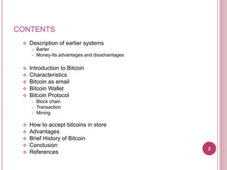 - A description of earlier barter and monetary systems that Bitcoin improved upon.