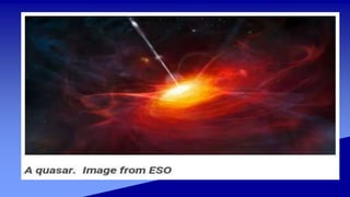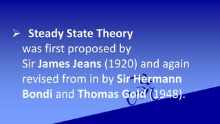 The Steady State Theory proposed that the universe has no beginning or end in time and appears the same from any point. It suggests new stars are continually created to replace those that have died, maintaining a steady state. The theory was proposed as an alternative to the Big Bang Theory. However, evidence emerged in the 1960s that contradicted Steady State Theory, including more distant radio sources in the early universe, discovery of quasars only in the early universe, and detection of the cosmic microwave background radiation, which is difficult to explain under Steady State Theory. The theory has since been discarded.