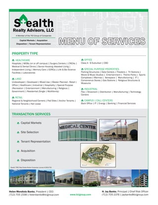 This document provides a menu of real estate services including capital markets, acquisition, disposition, and tenant representation across various property types such as healthcare, office, retail, industrial, campus, and call centers. It also lists transaction services and contact information for the company's president and chief risk officer.