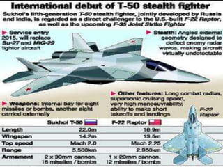 This document provides an overview of stealth technology, including its history, principles, applications, and future developments. It discusses how stealth works to reduce detection by radar, infrared, visual, and acoustic means. Key stealth aircraft are described, such as the F-117, B-2, F-22, and future projects. Stealth has allowed for espionage and more surgical military strikes but remains an expensive technology currently available only to few nations. Continued research aims to expand stealth capabilities to hypersonic speeds and new platforms while also reducing costs.
