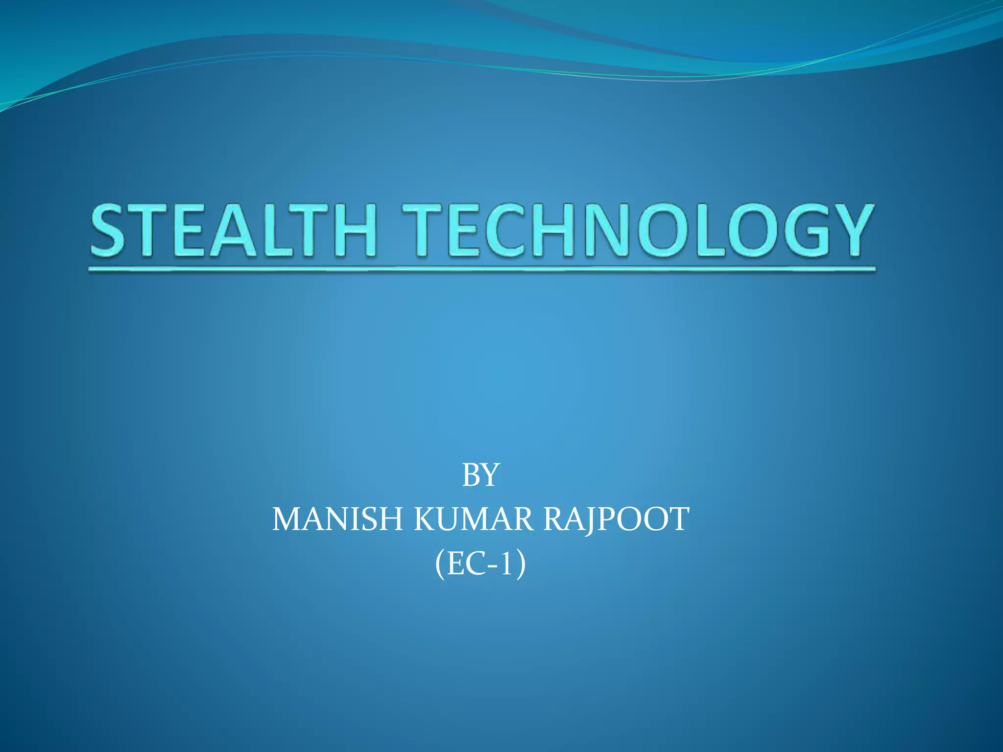 This document provides an overview of stealth technology, including its history, types of signatures that stealth aims to reduce, and methods used. It discusses radar absorbent materials and structures, as well as techniques to decrease infrared, acoustic, visual and other signatures. Examples of stealth aircraft like the F-117 and ships are given. Advantages like reduced detection and disadvantages like high costs are outlined. India's developments of stealth helicopters and aircraft are summarized. The future potential of stealth, including South Korea's KF-X fighter, is also examined.
