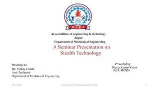 This seminar presentation summarizes stealth technology, its principles and applications. Stealth technology uses shapes, materials and other techniques to reduce detection by radar, sonar and infrared systems. It has various applications in naval warfare, allowing ships and submarines to conduct secret missions undetectably. Current uses include patrolling and spying, while future development focuses on improved designs and payloads. In conclusion, stealth technology remains an important topic despite counter-technologies challenging complete invisibility.