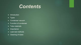 The document provides an overview of steam condensers used in power plants, detailing their types, functions, materials, and importance in maximizing efficiency and reusing water. It distinguishes between jet and surface condensers, discusses vacuum maintenance, air ingress issues, and leak testing methods. Additionally, it addresses fouling concerns and cleaning techniques to prevent operational inefficiencies.