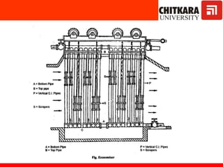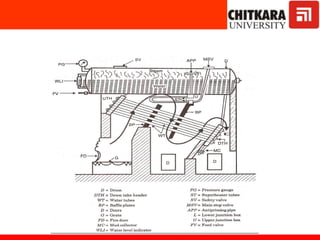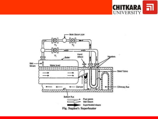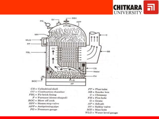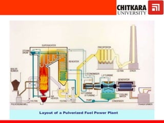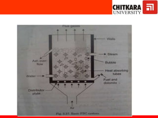 The document discusses fluidized bed combustion, which involves suspending solid fuel particles in a gas stream to create a fluid-like mixture that allows for more efficient combustion. It then explains the working of fluidized bed combustion systems and their advantages over conventional combustion, such as lower emissions and the ability to burn fuels with higher ash content. Key components of steam power plants like boilers, turbines, and condensers are also described.