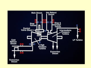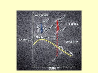 The document discusses turbine performance and efficiency in power plants, focusing on cycle efficiency and heat rate calculations. It details the main components that affect turbine cycle efficiency and addresses common myths related to efficiency testing. Additionally, it outlines the methodology for measuring turbine parameters and highlights the impact of turbine efficiency on heat rates and operating costs.