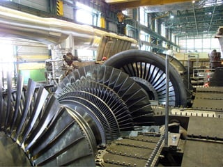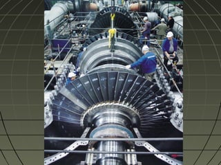 Steam turbines use the pressure energy of steam to power rotation of a shaft. There are two main types: impulse turbines, where steam jet kinetic energy changes the turbine blades' momentum; and reaction turbines, where continuous steam pressure drop over fixed and moving blades provides rotational force. Compounding involves using multiple stages to reduce turbine speed for practical use, through either velocity compounding by absorbing steam kinetic energy in stages, pressure compounding by expanding steam pressure in nozzles, or a combination of both approaches in pressure-velocity compounding turbines.