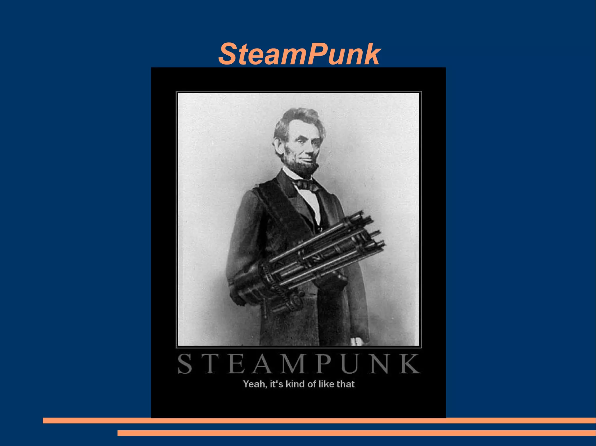 Steampunk refers to technology that looks and functions as if it was created during the steam era of the 19th century, often involving alternate histories where technological development took a different path. It shares themes of rebellion with cyberpunk but is usually set in a Victorian era setting rather than a dystopian future. Some famous steampunk works include The Difference Engine by William Gibson and Bruce Sterling, The League of Extraordinary Gentlemen by Alan Moore and Kevin O'Neil, and the anthology Steampunk features several steampunk stories.