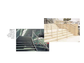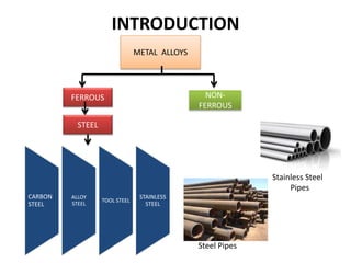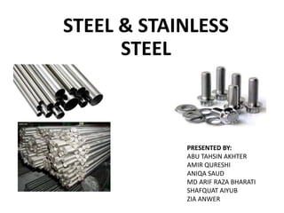 This document provides information on steel and stainless steel. It discusses the composition of steel as an alloy of iron and carbon, and stainless steel as containing a minimum of 10.5% chromium. It describes the properties and applications of different types and grades of steel and stainless steel, including in construction materials, appliances, transportation, infrastructure, and more. It also discusses the manufacturing process for steel and provides examples of architectural and structural uses of stainless steel.