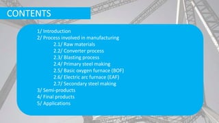 The document discusses the process of making steel, including the raw materials, production processes, and applications. Key points: