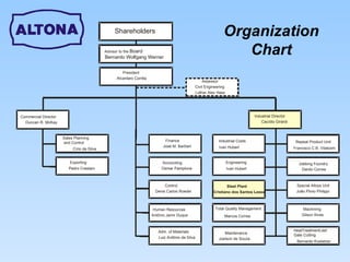 The document outlines the organizational chart and production processes of an engineering steel plant. It details the roles of leadership positions like the president and directors. It maps the flow of raw materials from storage through melting, refining, alloying and pouring processes. Key stages include loading scrap and alloys, melting in electric arc furnaces, secondary refining using AOD converters, heating ladles, and final pouring of liquid steel. Laboratories analyze raw materials and samples to control quality.