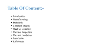 The document discusses the construction of a steel structure for the Canadian International College, detailing the advantages and disadvantages of steel, manufacturing processes, and structural steel standards in the US and Europe. It includes information on different shapes of steel, thermal properties, fire resistance, and installation methods. The presentation is collaboratively authored by students and presented to faculty members.