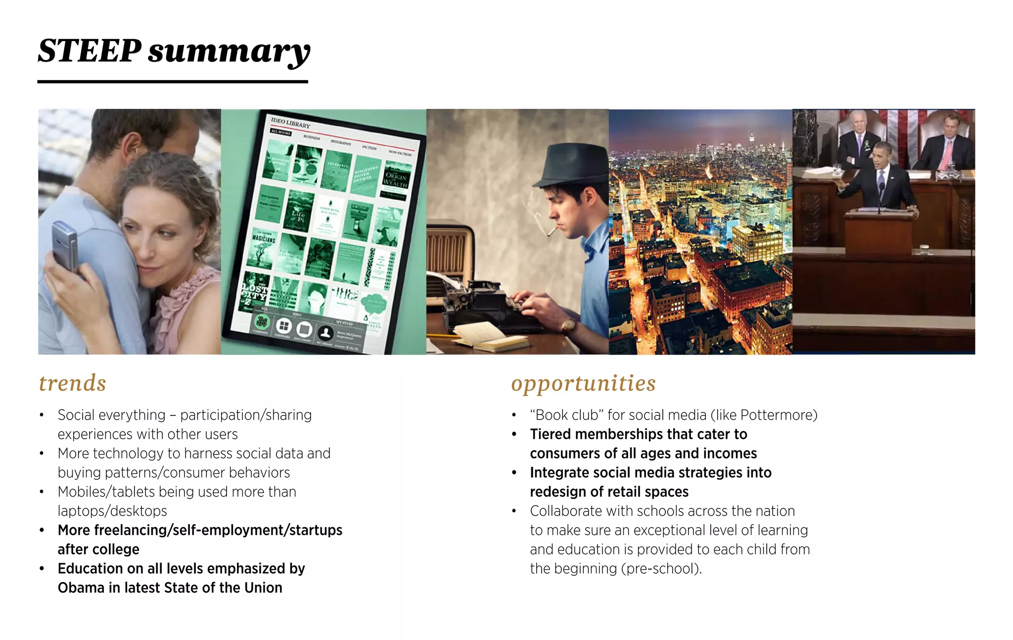 Mobile devices are being used more than desktops and tablets, enabling greater social participation and sharing of experiences. There are also opportunities to harness social and purchasing data to better understand consumer behaviors. Education is being emphasized at all levels, and schools could collaborate more with companies like Barnes & Noble to improve learning.