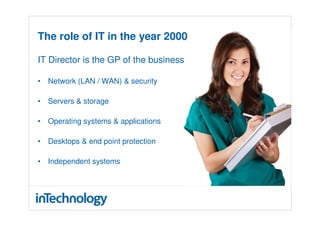 The role of the IT director is changing from managing all internal systems to focusing on applications and end users, leveraging specialist cloud providers. By 2020, the IT director will have board-level responsibility. This change is being driven by demands for business agility, cost reduction, and access from anywhere. Cloud adoption is forecast to continue growing strongly in 2012, with substantial movement of production workloads to the cloud like collaboration and ERP. When transitioning to the cloud, companies should assess their business needs and cloud readiness, develop a strategic IT plan, evaluate cloud delivery models, and carefully select reliable, secure cloud suppliers.