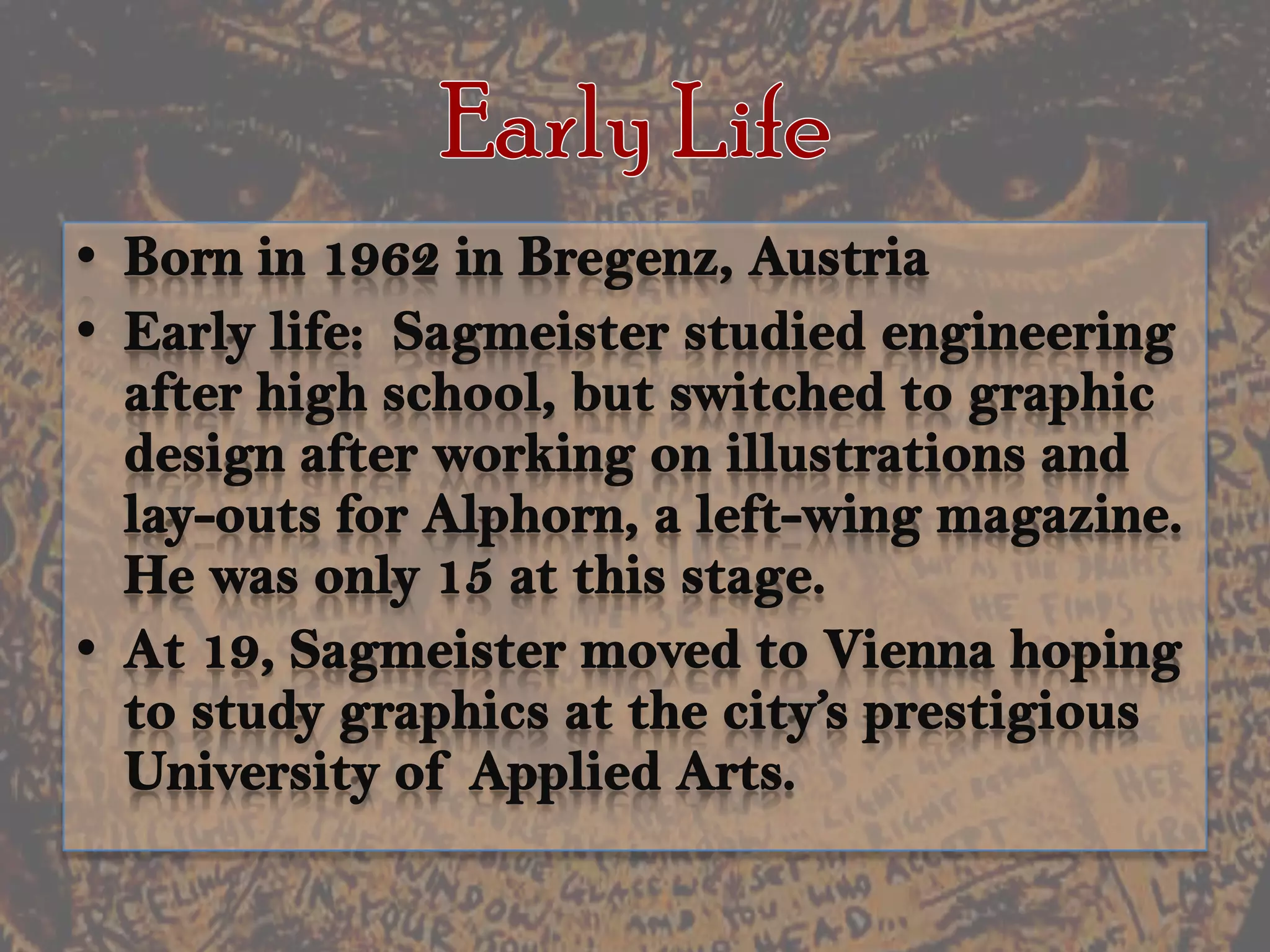 Stefan Sagmeister is an Austrian graphic designer born in 1962 in Bregenz, Austria. He originally studied engineering but switched to graphic design after working for a magazine. In 1991, he moved to Hong Kong to work for Leo Burnett before returning to New York in 1993 to work for Tibor Kalman. Sagmeister is known for pushing creative boundaries in his work for clients like Lou Reed, The Rolling Stones, and Aerosmith. He has won two Grammy Awards for his album packaging designs. Sagmeister's motto is "Design that needed guts from the creator and still carries the ghost of these guts in the final execution."