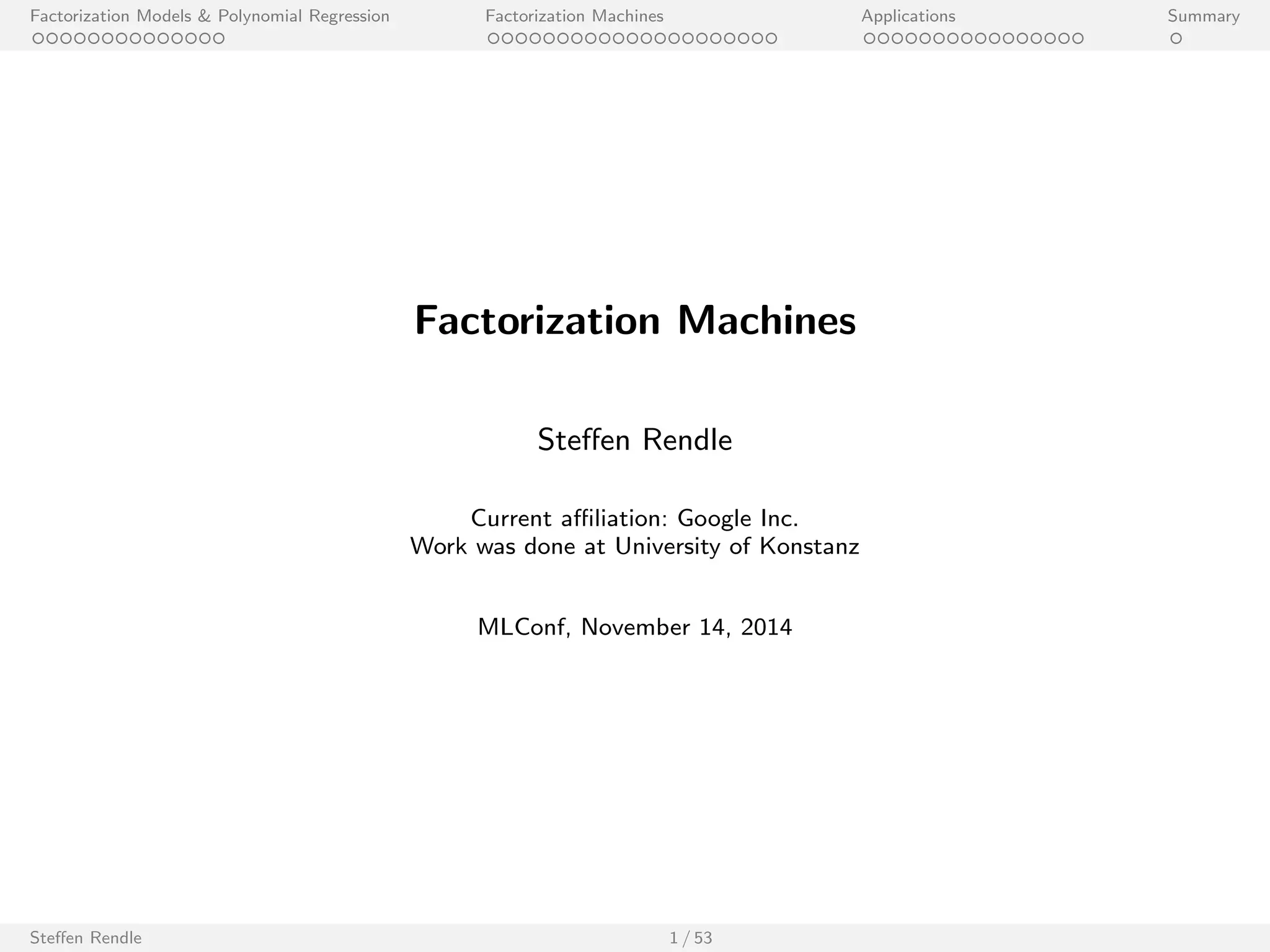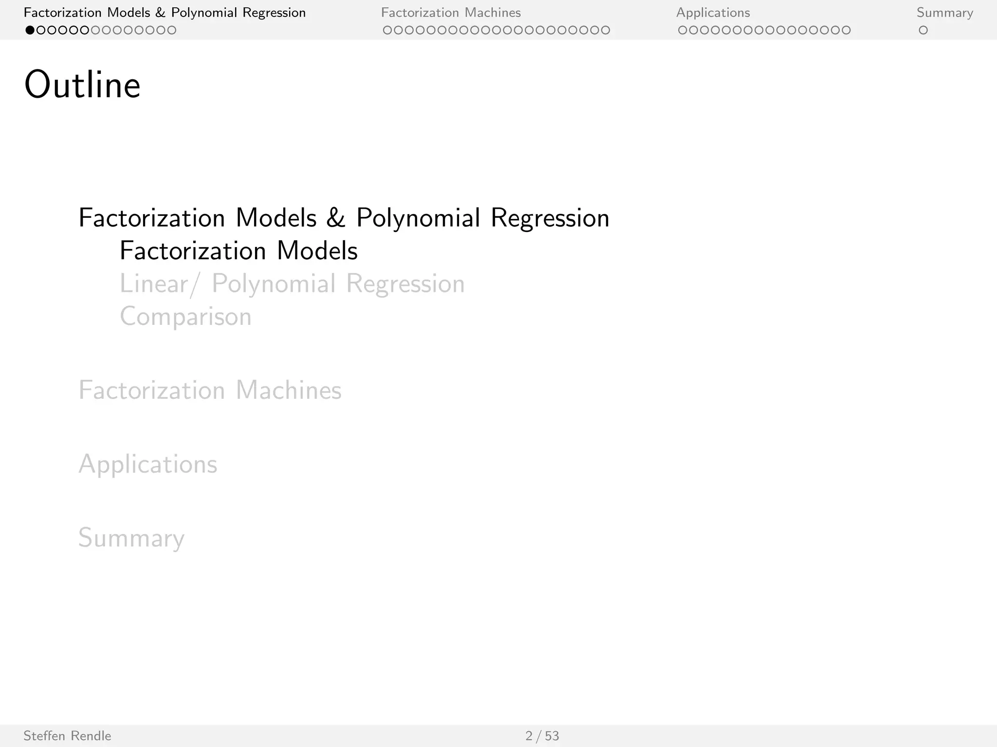 The document presents an overview of factorization models and their applications, particularly focusing on factorization machines and polynomial regression. It discusses advantages, disadvantages, and various examples of modeling interactions between variables through matrix and tensor representations. The document also highlights the challenges faced by traditional regression models in handling sparse feature vectors.