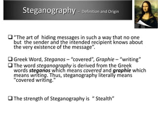 The document discusses steganography, which is hiding messages within other files or signals in a way that is not detectable. It defines steganography as "the art of hiding messages in such a way that no one but the sender and the intended recipient knows about the very existence of the message." The document outlines different forms of steganography including hiding information in text, images, audio and video files. It also discusses some known uses of steganography such as economic espionage, terrorism, and child pornography.