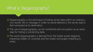 Steganography is a technique for hiding secret data within ordinary files like images, audio, or video in order to avoid detection. The secret data is embedded using an algorithm and extracted at the destination. It can be combined with encryption for added security. Common techniques include hiding data in the bits representing redundant color pixels in images or adding secret files to audio that only the receiver can extract. The word steganography comes from Greek and means "covered writing."
