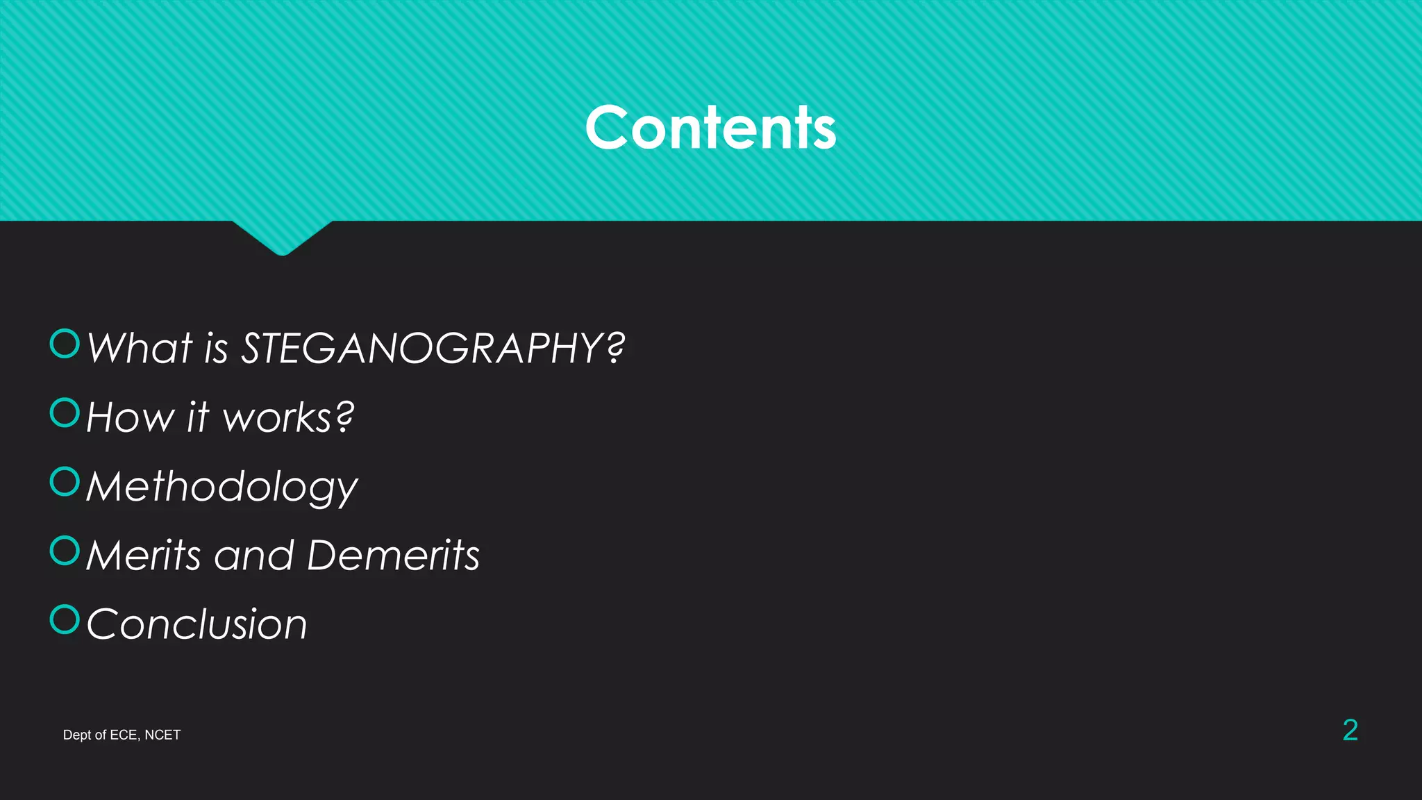 This document discusses steganography, which is the practice of concealing a secret message within another message or file. Modern steganography methods digitally embed messages in text, images, or audio files. The document explains how the least significant bit method works to hide messages in image and audio files by replacing the least significant bits of bytes with message bits. While steganography provides secure communication, it also has the drawbacks of increasing data size and requiring a complex encoding process.