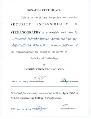 The document provides details about a project report on security extensibility in steganography. It discusses existing steganography techniques like the Least Significant Bit (LSB) algorithm and their drawbacks. It proposes developing a new Security Extensibility Algorithm (SRM algorithm) to provide better security for steganography compared to the LSB algorithm. The SRM algorithm would be used for steganography, cryptography, password authentication, and digital watermarking. The report outlines the system analysis, design, and testing of the proposed SRM algorithms to enhance security when embedding secret messages within digital files.