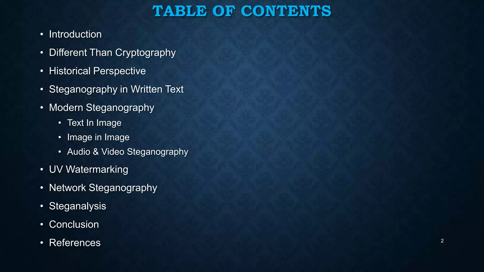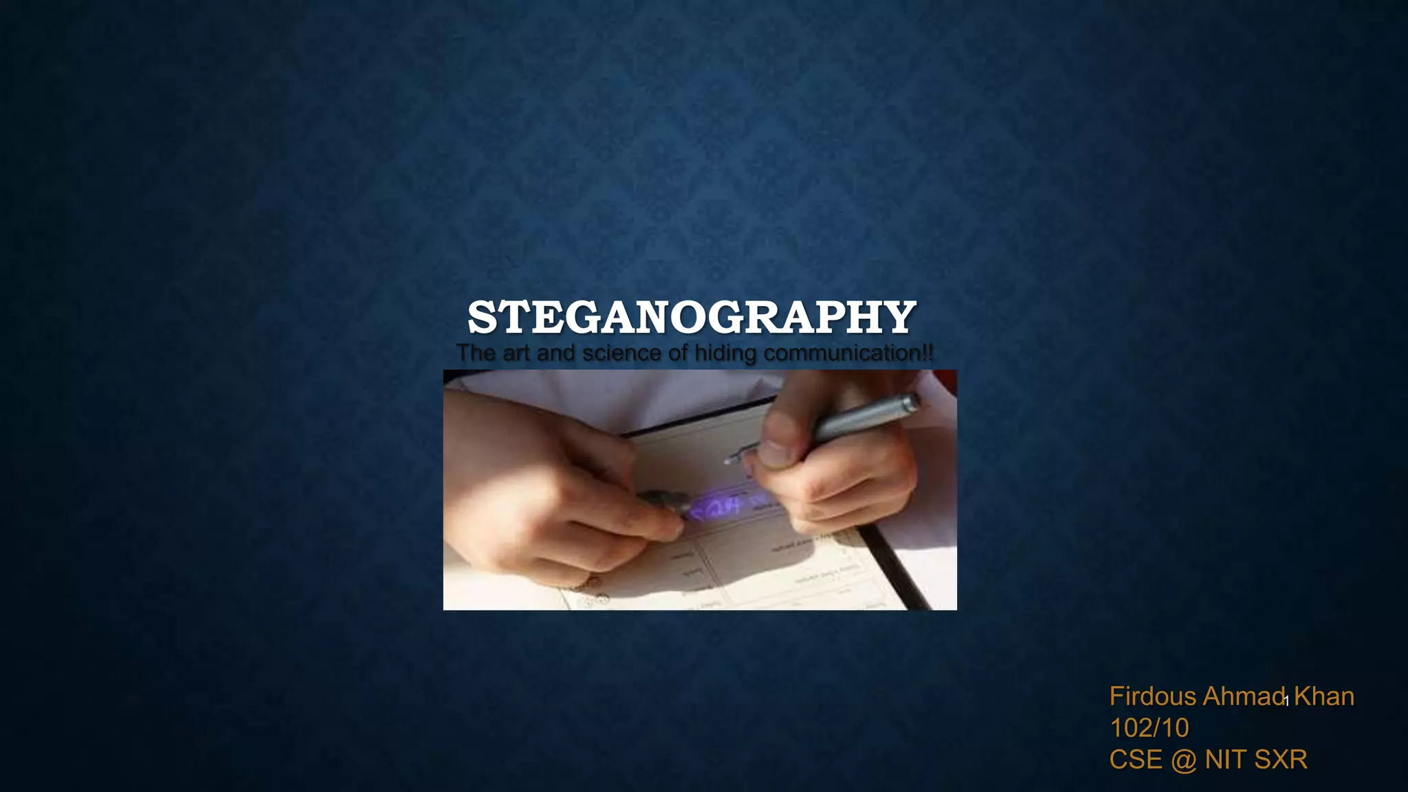 The document provides an overview of steganography, which is the practice of hiding secret messages within other innocent messages or files. It discusses the differences between steganography and cryptography, various historical uses of steganography, and modern techniques such as hiding messages in digital images, audio, video and network traffic. The document also briefly outlines tools for steganography, challenges in steganalysis, and concludes with references for further information.